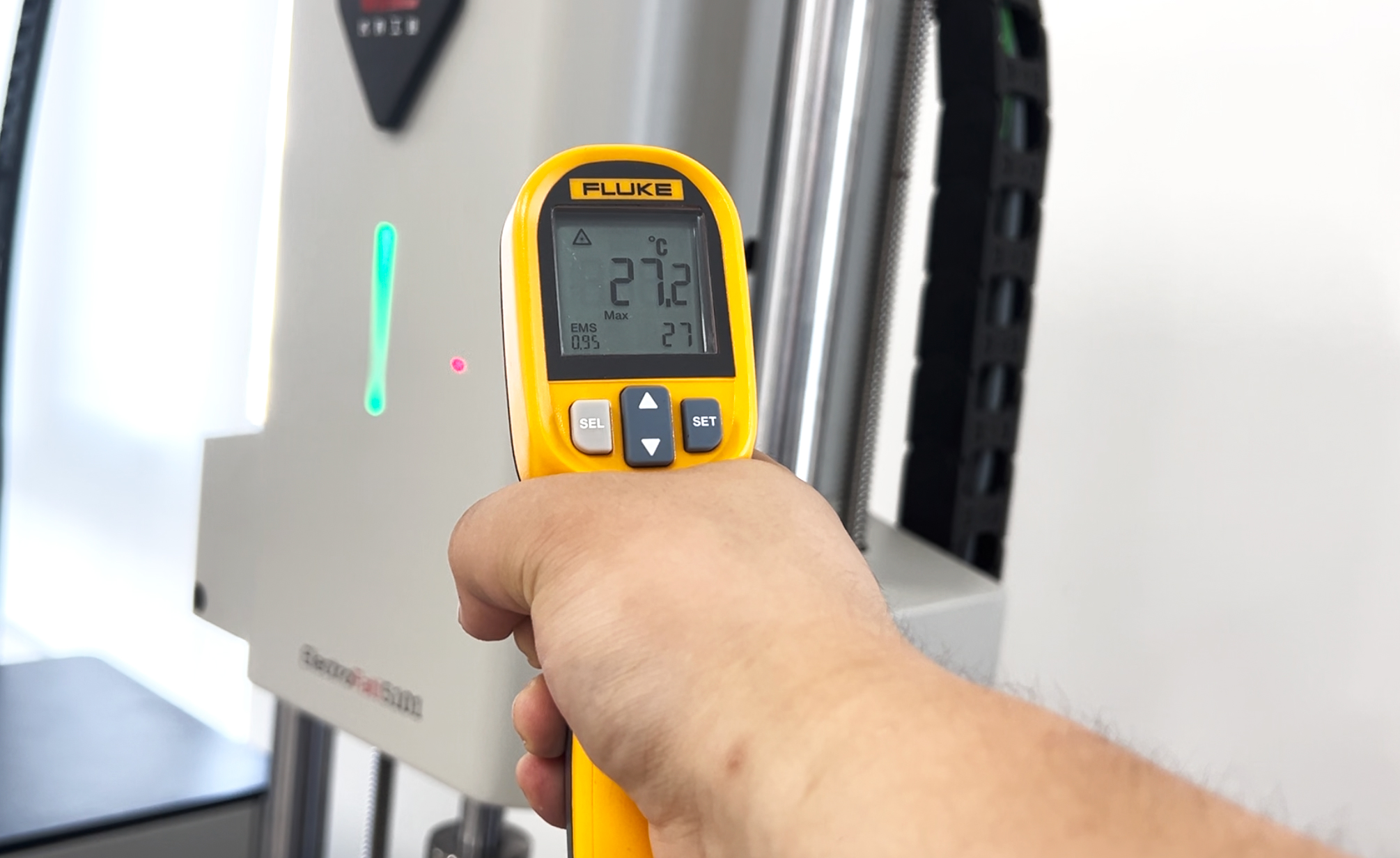 除此之外,ElectroFati 5101采用电磁驱动,作动器没有硬件接触产生摩擦,因此不会因为摩擦产生损耗,工作中产生的热量也很低;特殊的散热结构设计,也为设备高效散热、稳定运行提供了有效保障。我们随机对工作中的设备进行了温度测量,见下图2。