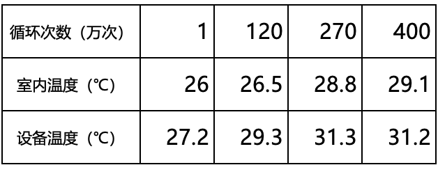 (3)设备连续加载400万次循环以后,在室温29.1℃环境下,设备运行温度仅为31.2℃,能耗低、产生热量低、散热性能好;